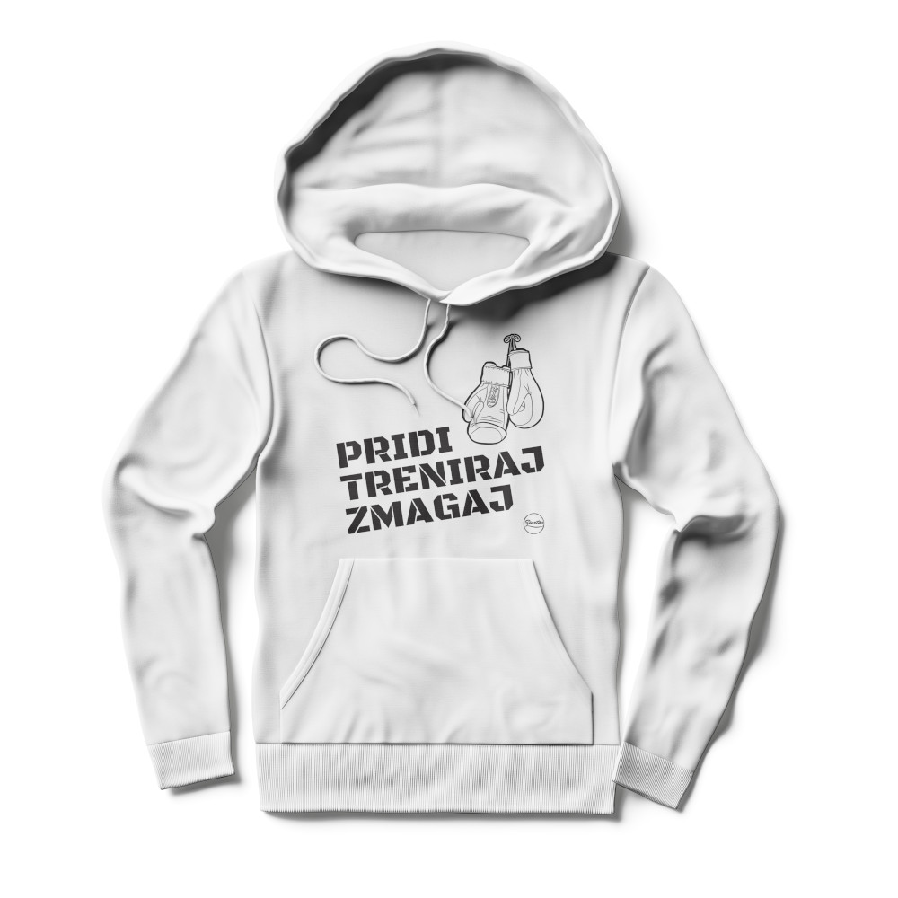 Pulover s kapuco z napisom Pridi treniraj zmagaj, bel. Iz lahkega in trpežnega materiala, primeren tudi za intenzivno vadbo.